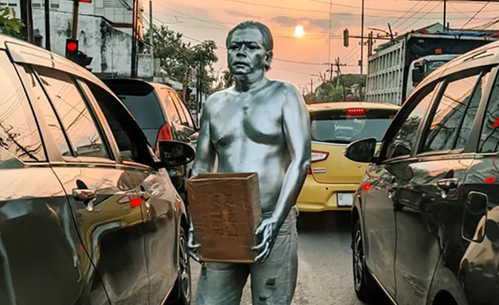 Tak lama berselang, pelaku yang merupakan manusia silver ini datang untuk minta sumbangan.